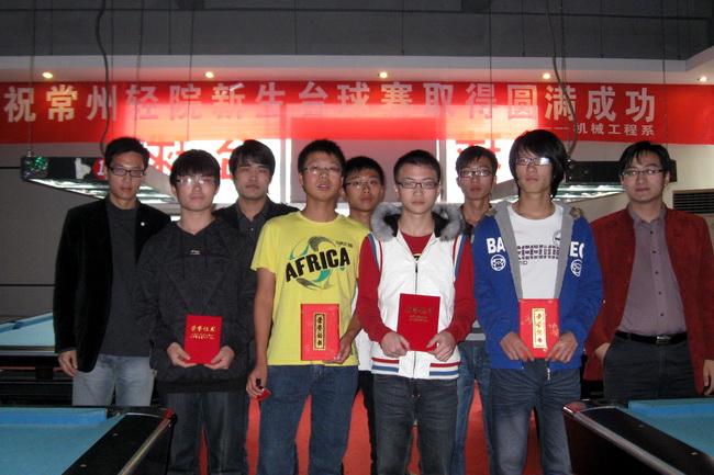 比賽結束后,比賽贊助商名仕撞球館經理趙波、機械工程系團委書記汪洋、臺球協會社團指導老師王平分別為一等獎、二等獎、三等獎頒獎。輕化系的蘇志森同學摘得桂冠,信息系的朱文彬、電子系的馬輝獲得二等獎,輕化系的蘇佩弘、管理系的王安康、管理系的蔡志國獲得三等獎。