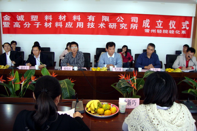 首先金誠塑料材料有限公司董事長兼總經理張國政就該公司自籌備以來公司試運行情況作工作匯報,金誠塑料材料有限公司屬我院輕化系學生創業公司,依托高分子材料應用技術研究所的技術支持進行高分子材料產品進行研發和生產,經過一段時間的運作已取得了一定的成效。同時上半年申報的兩個創新項目分獲常州市創業創新大賽二、三等獎。接著戴主任就研究所成立的背景及開展項目情況向與會人員作了簡要介紹,高分子材料應用技術研究所由具有實際經驗的教師組成的科研團隊,宗旨是為企業提供技術服務、技術開發、技術合作,戴主任希望金誠塑料材料有限公司業務興旺,鍛煉學生技能,規范運行;研究所老師不斷提高業務能力,更好為校企服務。市場部葛主任代表市場部對我系金誠塑料材料有限公司暨高分子材料應用技術研究所成立表示熱烈祝賀,對在校大學生創業表示高度的支持和鼓勵,也充分肯定了我系在就業創業方面的成績。