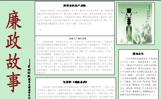 為響應學院廉政建設號召,模具系學生會30日下午在武進區名仕佳園小區進行了一次以“黨政廉潔”為主題的宣傳活動,主要進行方式是以學生發放廉政故事宣傳單為主,主要對象是小區居民,路上行人等。