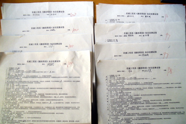 今年是《中國共產黨黨員領導干部廉潔從政若干準則》頒布實施年。機械工程系近期在全系范圍內開展了廉政知識競賽,以此把《廉政準則》的學習宣傳引向深入。機械工程系全體教師、學生黨員、團委學生會干部、各班班長團支書共計119人參加了競賽。