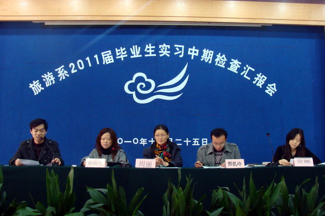 為使旅游系2011屆畢業生認清就業形勢,樹立正確的就業觀和擇業觀,加強實習學生中期管理,促進學校文化與企業文化的融合,旅游系于11月25日下午在教學樓二號報告廳召開了2011屆畢業生實習中期檢查匯報會。旅游系主任周麗、副主任陳曉琴、副書記邢凱嶺、系辦主任張衛兵、分團委書記陳東生,輔導員常娜、崔曉曙老師以及2011屆畢業班班主任、專業教師和全體畢業生參加了會議。會議由旅游系黃志剛老師主持。