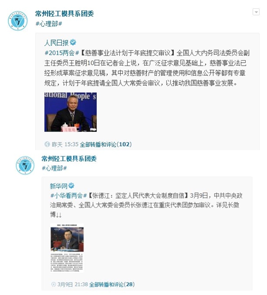 模具系團委微博和微信也在實時關注兩會,隨時向廣大學生們轉播兩會實況、焦點議案,給同學們提供交流平臺。