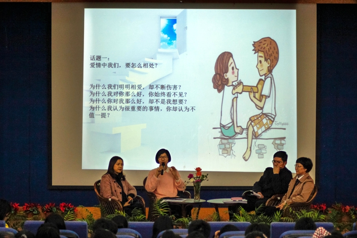 3月25日下午,由學(xué)工處心理健康教育中心在教學(xué)樓3201舉辦了一場“老中青”三代談“愛情”的沙龍活動。3點整,在同學(xué)們熱烈的掌聲和呼喚中,學(xué)院吳亞萍教授、柏鐵山副教授、張銀老師一一登場,活動由招生處處長、心理健康教育中心主任胡劍虹教授主持。