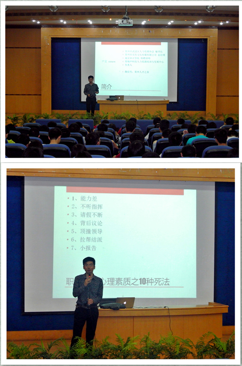 從高校畢業(yè)生就業(yè)與企業(yè)招聘中的雙選活動來看,職業(yè)勝任往往成為關(guān)鍵所在。職業(yè)勝任特征一般分為兩個部分:表面部分是我們可以直接了解到的部分,包括知識、技能、自我認(rèn)知等;深層次部分如心理動機(jī)、個人特質(zhì)等。尹經(jīng)理從HR角度分享了職業(yè)人在員工的心理素質(zhì)中的分析,結(jié)合我院模具系瑞聲班實(shí)際深入淺出解答了如何勝任企業(yè)的職業(yè)需求,受到與會學(xué)生的歡迎。尹經(jīng)理還結(jié)合武進(jìn)區(qū)人力資源大學(xué)生就業(yè)現(xiàn)狀,有針對性引導(dǎo)學(xué)生正確面對就業(yè),從個人簡歷制作到面試問題進(jìn)行了闡述,同學(xué)們表示受益匪淺。