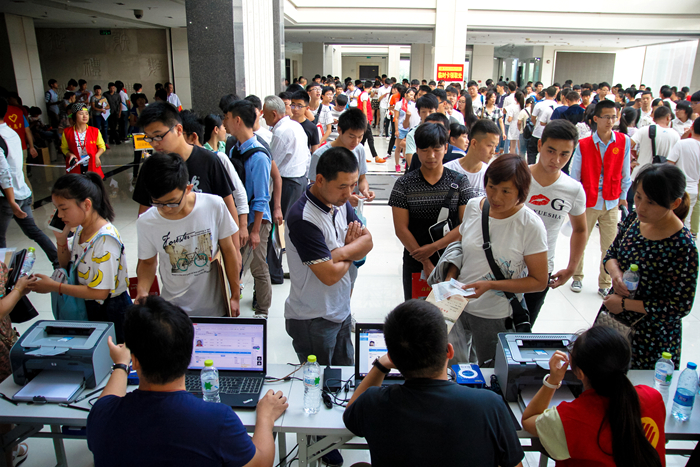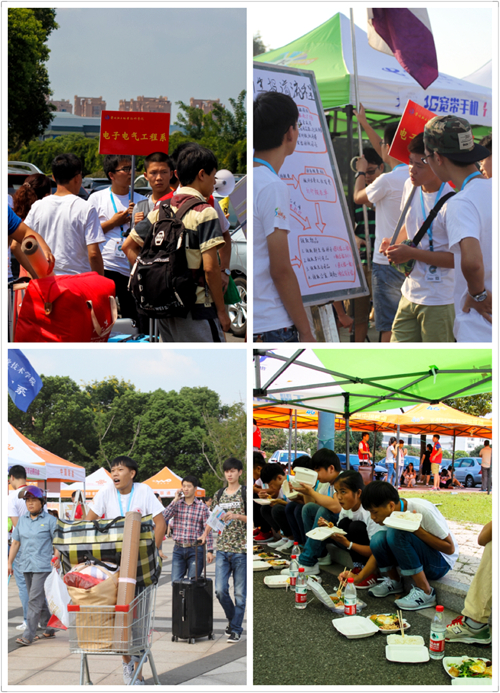 太陽(yáng)漸高,越來(lái)越多的新生來(lái)到輕院北門,一部分志愿者在校門口舉著電子電氣工程系的牌子,將攜帶大包小包的新生家長(zhǎng)和學(xué)生帶到相應(yīng)的班級(jí)展臺(tái)前,由班主任和副班接待。班主任一邊登記學(xué)生信息,一邊與新生和家長(zhǎng)交流,了解他們的情況。剛剛指引新生回來(lái)的志愿者滿頭大汗,還沒(méi)來(lái)得及坐下,又拎起新生的行李出發(fā)了,這些志愿者需要全程指引新生完成注冊(cè)流程,極大地提高了新生報(bào)到的效率。