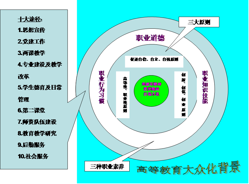 七、縱觀我院辦學歷史,剖析我院文化建設現狀,將我院文化建設放到時代大背景尤其是高等教育大眾化這一背景中去考察分析,基于現代職業教育的質量觀人才觀,著眼于學生、學校未來發展和核心競爭力的提高,我們把我院學校文化建設大綱的內容概括為:一種精神,三大原則,三種素養,十大途徑(見圖示)。
