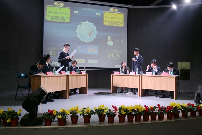 本屆辯論賽辯題圍繞學院“學生綜合素質提升工程”,以“文明修身”為主題,貼近大學生活,涉及家庭教育、學校教育等問題。大賽設立初賽、復賽和決賽三級賽制,來自各二級學院共八支代表隊積極參與。決賽在信息學院代表隊和電氣學院代表隊之間進行,雙方圍繞“青少年素質的提高主要靠家庭養(yǎng)成/學校教育”這一辯題展開辯論,辯手圍繞本方觀點,拿出古今中外的典型例子,在申明自己立場的同時,也頻頻發(fā)問把對方的觀點推倒。針尖對麥芒,雙方各展其長,為觀眾帶來了精彩紛呈的視聽盛宴。在觀眾提問階段,有些觀眾也頗具辯手風范,提出的問題涉及各個方面,相當具有典型性和針對性。