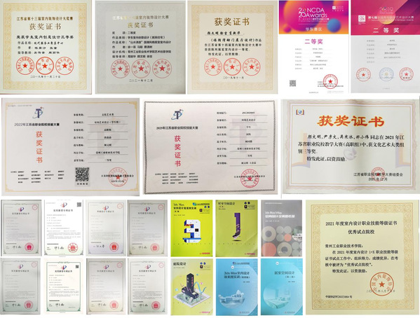 學生積極參與各類設計競賽,成績斐然。近5年學生設計作品在歷屆江蘇省室內裝飾設計大賽中獲多個一等獎7項、二等獎和三等獎20余項,全國數字藝術設計大賽中獲多個一等獎5項、二等獎和三等獎15余項,江蘇省畢業設計和優秀畢業設計團隊獎5項、江蘇省學生職業技能大賽一等獎2項、二等獎和三等獎10余項、江蘇省大學生創新訓練項目5項、授權實用新型專利10余項。