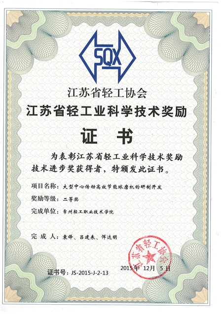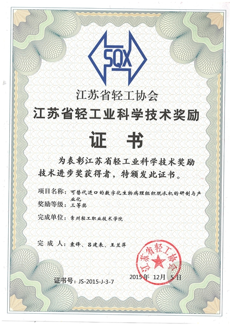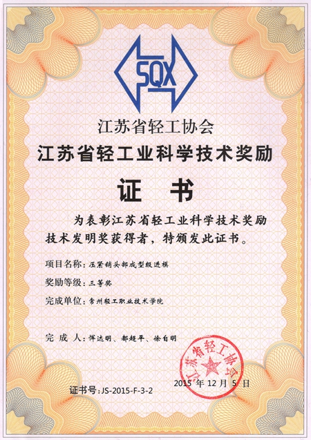 我院袁鋒教授申報的“大型中心傳動高效節能球磨機的研制開發”“替代進口的數字化生物病理組織脫水機的研制與產業化”兩個項目成果分獲2015年度江蘇省輕工協會科技進步二、三等獎。惲達明老師申報的“壓緊銷頭部成型級進模” 獲2015年度江蘇省輕工協會科技發明三等獎。