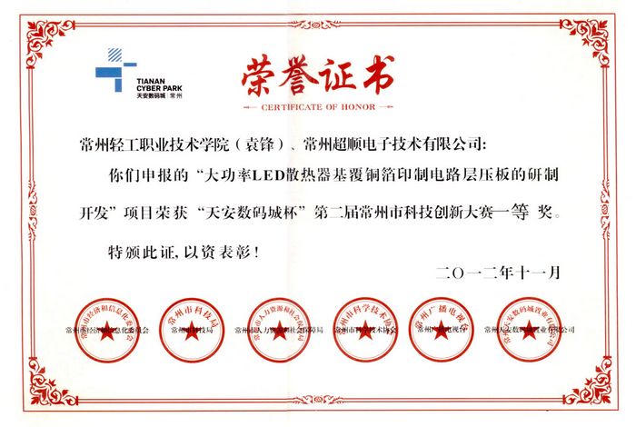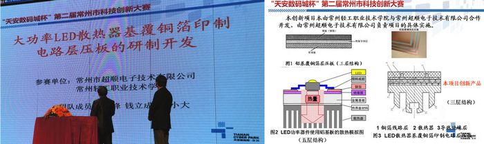 歷時近七個月的“天安數碼城杯”常州市第二屆科技創新大賽11月24日在市工人文化宮落下帷幕。通過項目闡述和PK辯論,我院袁鋒教授與常州超順電子技術有限公司合作的“大功率LED散熱器基覆銅箔印制電路層壓板的研制開發”的科技創新項目獲得了本屆科技創新大賽的冠軍。