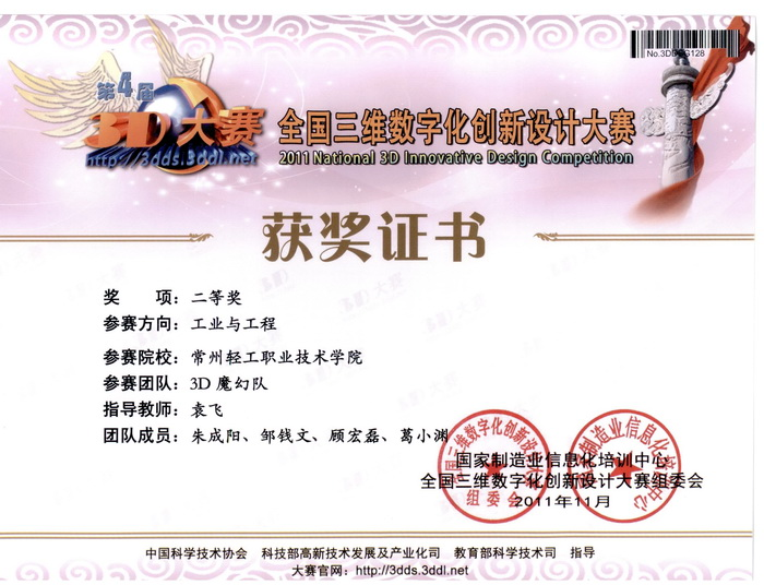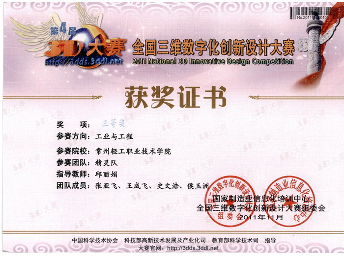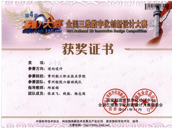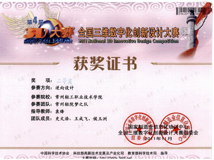 “2011全國三維數(shù)字化創(chuàng)新設(shè)計大賽總決賽”獲獎名單公布,我院工業(yè)工程組參賽隊共獲 3個二等獎與1個三等獎。獲獎團隊和指導(dǎo)教師分別是:袁飛老師指導(dǎo)的“3D魔幻隊”獲得工業(yè)與工程組參賽方向二等獎, 邱麗娟老師指導(dǎo)的“常州輕院六驅(qū)動戰(zhàn)隊”和袁鋒老師指導(dǎo)的“常州輕院夢之隊”獲得逆向設(shè)計參賽方向2個二等獎,另外,邱麗娟老師指導(dǎo)的“常州輕院精靈隊”獲得工業(yè)與工程組參賽方向三等獎。
