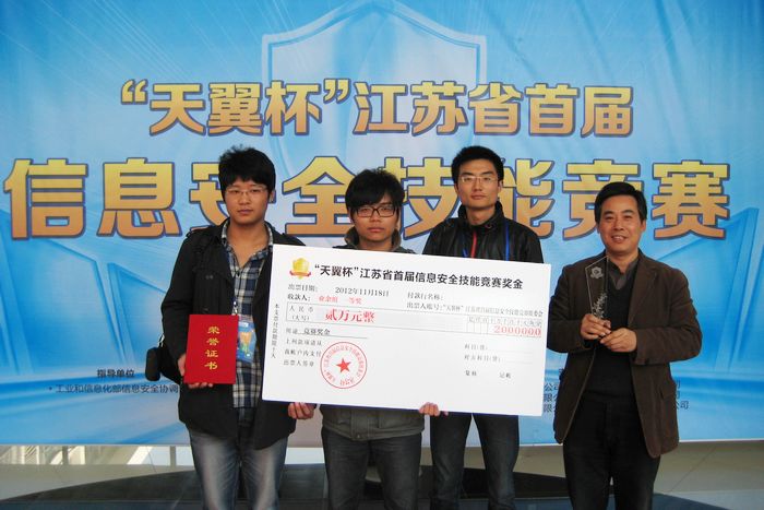 再回到2012年11月的那場大賽。常州輕院信息系派出由董廣東、趙赫、束旋三名同學組成的團隊,參加省經濟和信息化委員會、省教育廳聯合舉辦的“天翼杯”江蘇省首屆信息安全競賽。全省共有103個網絡信息安全的團隊參加比賽,隊伍分成兩組:一組是專業組,成員為省內知名的網絡安全公司人員;另一組是業余組,成員為省內高校(如南京大學、東南大學、南京理工大學、江蘇大學等高校)大學生團隊以及社會人員組成的團隊。