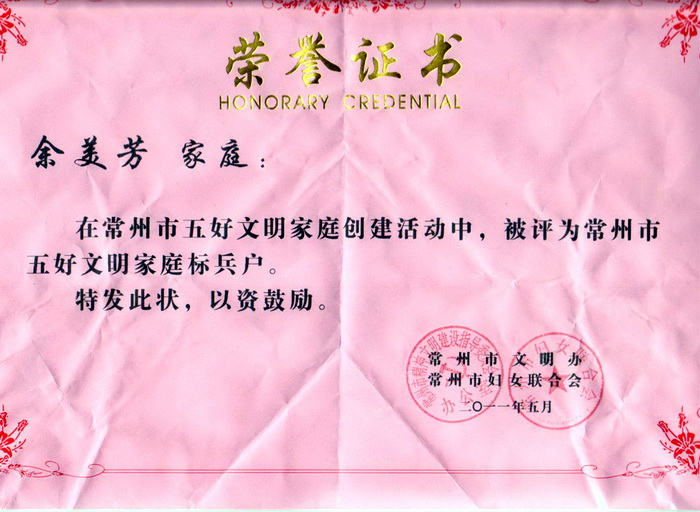 常州市五好文明家庭標兵證書
