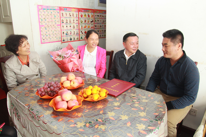 1027下午,常州市委常委、科教城黨工委書記徐光輝,常州市婦聯主席周廣菊、我院黨委副書記張濤、模具系黨總支書記張燏等領導一行專程來到余美芳家看望了他們全家,并對她們家庭的此次獲獎表示了祝賀。