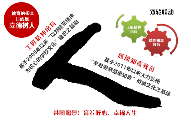 我們對兩大資源開發利用的基本思路是:基于以人文教育涵養工匠精神的理念,以兩大校本文化資源為發軔點,構建“工匠精神培育”和“感恩知責教育”的雙輪聯動的學校文化育人模式,立德樹人,努力實現師生共同愿景——“育養匠心,幸福人生”。