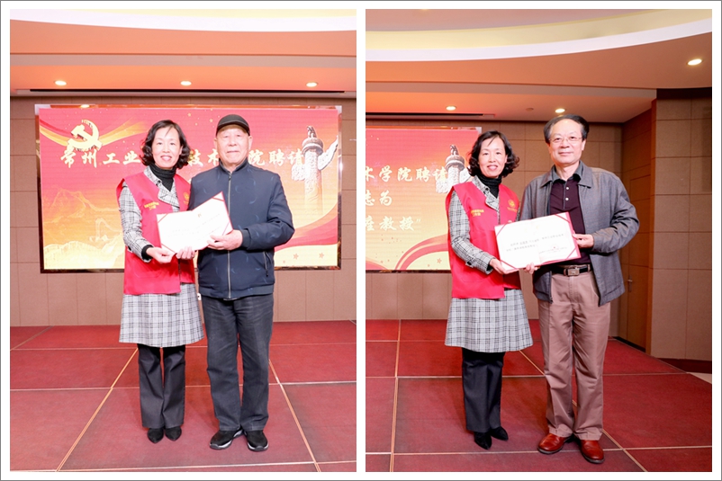 黨群部門黨總支書記、工會副主席、關工委第二秘書長陳文蕾為老黨員、離休老干部胡友艾同志頒發了“紅色宣講員”聘書,希望他有機會來學校為師生講授他親身經歷的淮海戰役。陳文蕾還為金東方頤養園黨支部書記金建勇頒發了“康養課題客座教授”證書,希望他到學校來為師生們傳授健康養生知識。