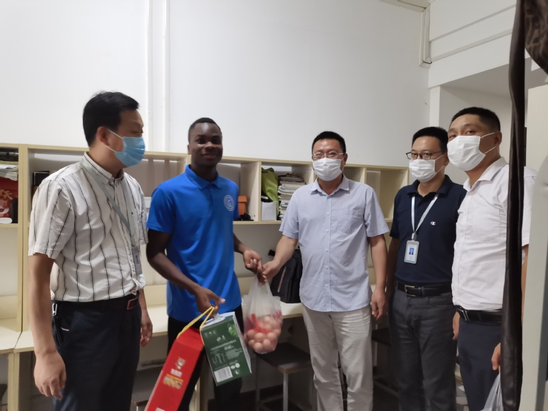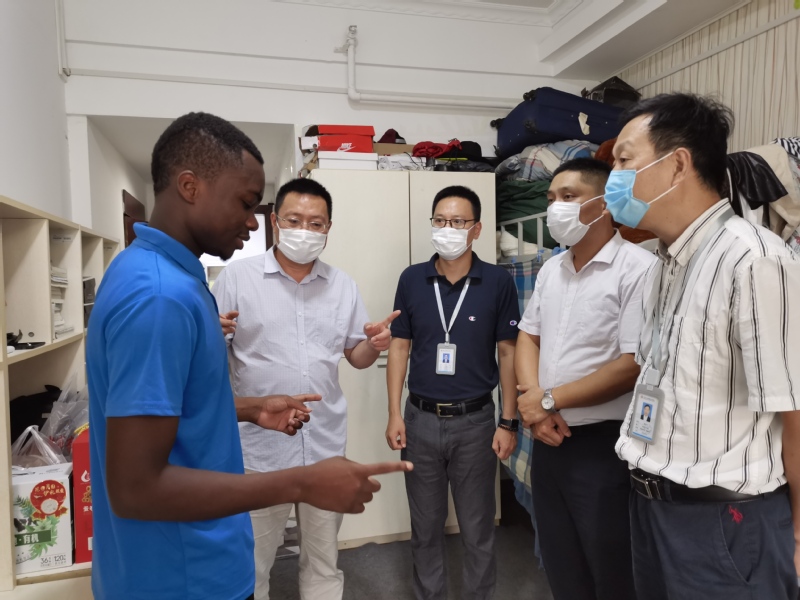 姚慶文現(xiàn)場(chǎng)查看了留學(xué)生公寓疫情防控措施落實(shí)情況,慰問(wèn)了所有在校的留學(xué)生,并與受傷留學(xué)生貝爾親切交談,詢問(wèn)他的身體狀況和平時(shí)學(xué)習(xí)生活情況。姚慶文叮囑海外教育學(xué)院要幫助解決在校留學(xué)生的實(shí)際困難,全體教師要關(guān)注學(xué)生的身心健康,保障學(xué)生安全,防患于未然。