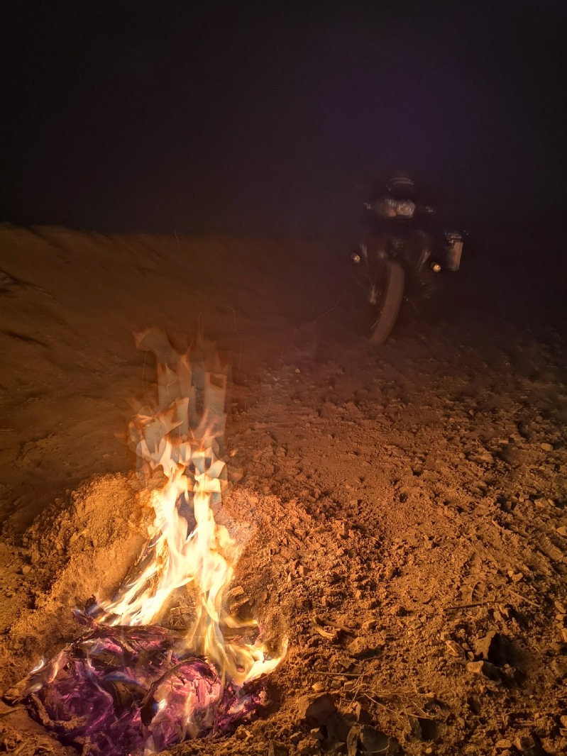 “今夜不知何處宿,平沙萬(wàn)里絕人煙”,夜越來(lái)越深,他心頭的恐怖也越來(lái)越濃。偶爾會(huì)有小動(dòng)物遠(yuǎn)遠(yuǎn)地注視著這位沙漠中的異類,眼睛發(fā)出綠色的光。他獨(dú)自向前走,弄些枯樹(shù)枝來(lái)生火,竟不敢輕易回頭看,因?yàn)榭炊嗔恕侗I墓筆記》,他生怕書(shū)中的情景再現(xiàn)。整個(gè)上半夜,摩托車他都沒(méi)有歇火,畢竟,發(fā)動(dòng)機(jī)的聲響可以減輕他的恐懼。