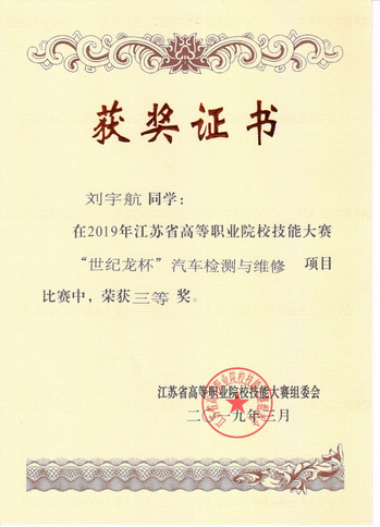 學生積極參加各類技能技術比賽,獲得江蘇省職業院校技能大賽“汽車技術”賽項19年、20年三等獎。