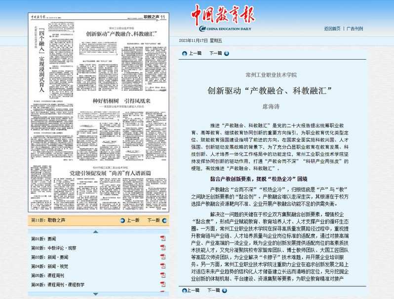 11月17日,《中國教育報》刊發了我校黨委書記席海濤的署名文章《常州工業職業技術學院:創新驅動“產教融合、科教融匯”》。文章指出,推進“產教融合、科教融匯”是黨的二十大報告提出統籌職業教育、高等教育、繼續教育協同創新的重要方向指引,為職業教育優化類型定位、賦能教育強國建設指明了前進的方向。在國家全面實施科教興國、人才強國、創新驅動發展戰略的背景下,常州工業職業技術學院堅持發揮協同創新的驅動作用,打通“產教合而不深”“科研產業兩張皮”的梗阻,有效推進“產教融合、科教融匯”。
