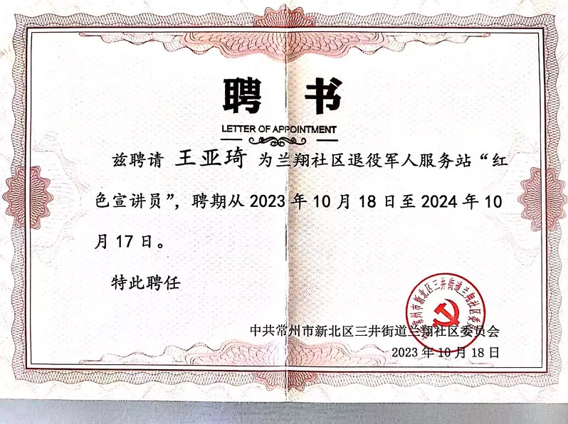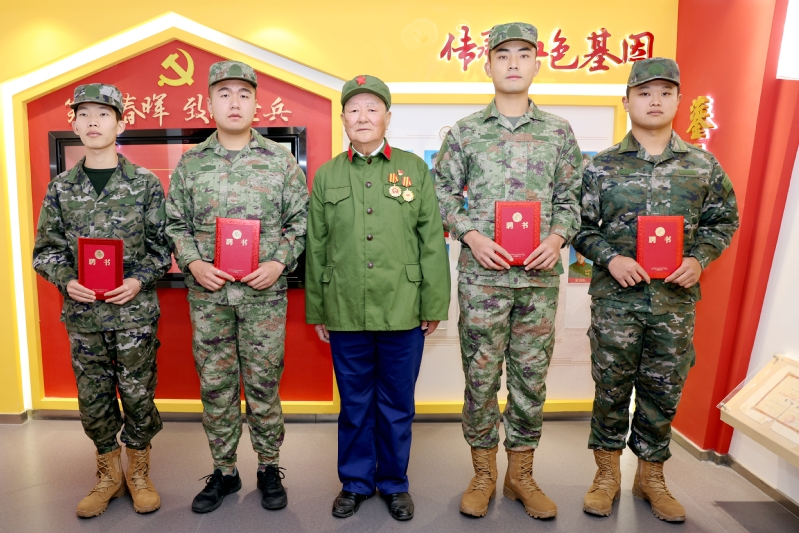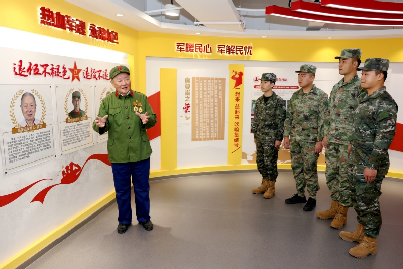 蘭翔社區(qū)抗美援越老戰(zhàn)士陸恩和,是數(shù)字商務(wù)學(xué)院關(guān)工委特聘教師。他身為社區(qū)老兵志愿服務(wù)隊的一員,當天身穿綠色戎裝、佩戴榮譽獎?wù)拢瑤ьI(lǐng)師生們實地參觀了蘭翔社區(qū)退役軍人服務(wù)站文化展廳,飽含深情地向師生們分享了從軍經(jīng)歷,細細講述了援越抗美出國作戰(zhàn)的歷史背景,艱苦卓絕的戰(zhàn)斗生活條件以及“熱血軍魂 永葆本色”的老兵故事。此外,陸老還在社區(qū)內(nèi)開設(shè)了革命故事道德講堂,宣傳紅色文化,以實際行動深耕老兵精神。他積極邀請4名大學(xué)生退役士兵擔任服務(wù)站“紅色講解員”,為他們頒發(fā)了聘書,希望青年人能夠充分發(fā)揮退役軍人帶頭模范作用,運用老兵特長,將紅色基因融入個人成長發(fā)展,在勤學(xué)苦練中增加知識、增強本領(lǐng),積極投身到祖國建設(shè)實踐中。