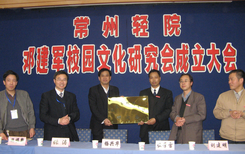 成立鄧建軍校園文化研究會(后改為“鄧建軍學(xué)校文化研究會”),左3為時任黨委書記楊興華,左2為時任黨委副書記張濤