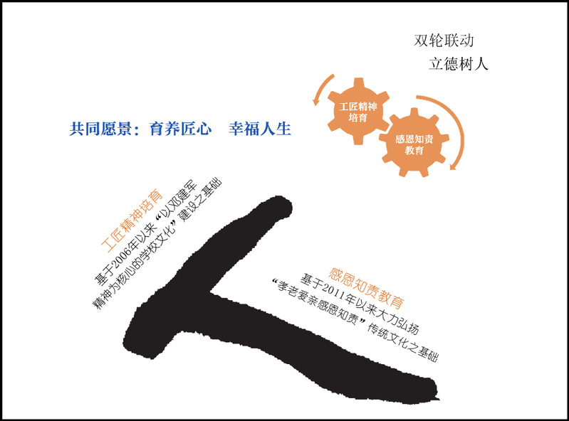 “愛崗敬業(yè),自強(qiáng)不息”——“孝老愛親,明禮友善”,兩兩相對的確很整齊,但是如果不能闡述出二者之間的邏輯關(guān)系,這樣的結(jié)合也就缺乏內(nèi)在力量,有“硬湊”的嫌疑。后來我購買了一本日本著名工匠秋山利輝的《匠人精神》,方知秋山利輝在培養(yǎng)工匠時將“孝老愛親”和“感恩”作為必備品德,他認(rèn)為:“只有經(jīng)過集體生活,才能培養(yǎng)替人著想、關(guān)心他人的心,以及感恩的情感。其中,最重要的是孝心,不孝順的人不能成為一流匠人。”秋山利輝的論述和實(shí)踐的成功,給了我底氣,我提出二者之間是“雙輪聯(lián)動”的關(guān)系,并且將“孝老愛親,明禮友善”改成了“孝老愛親,感恩知責(zé)”,歸納出以下論斷:我們秉承“以特色人文教育涵養(yǎng)工匠精神”的理念,以受到習(xí)近平接見的余美芳家庭孝老愛親事跡為發(fā)軔點(diǎn),引導(dǎo)師生“孝老愛親,感恩知責(zé)”,樹立“利益他人、利益社會”的人生志向,放下功利心選擇進(jìn)取心,形成“工匠精神培育”和“感恩知責(zé)教育”的雙輪聯(lián)動的學(xué)校文化育人模式,培養(yǎng)既有人文底蘊(yùn)又具工匠精神的發(fā)展型、復(fù)合型、創(chuàng)新型技術(shù)技能人才,立德樹人。我還借助自己純文科生拙樸的手,設(shè)計(jì)出了“‘工匠精神培育’和‘感恩知責(zé)教育’雙輪聯(lián)動的學(xué)校文化育人模式示意圖”。有個學(xué)機(jī)械的老師開玩笑說我那兩個輪子“聯(lián)動不起來”,我辯解說:“示意圖示意圖,讓人知道意思就行了嘛。”我想,如果兩個輪子真的符合了機(jī)械專業(yè)老師的要求,可能會影響畫面美感。時任黨委書記繆昌武第一次聽我宣講特色文化時,我來了個設(shè)問:“‘工匠精神培育’和‘感恩知責(zé)教育’二者是什么關(guān)系呢?”沒等我說出答案,他就搶答說:“是兩個輪子的關(guān)系。”坐在旁邊的校長楊勁松一聽樂了:“對對對,示意圖上就是‘雙輪聯(lián)動’關(guān)系。”