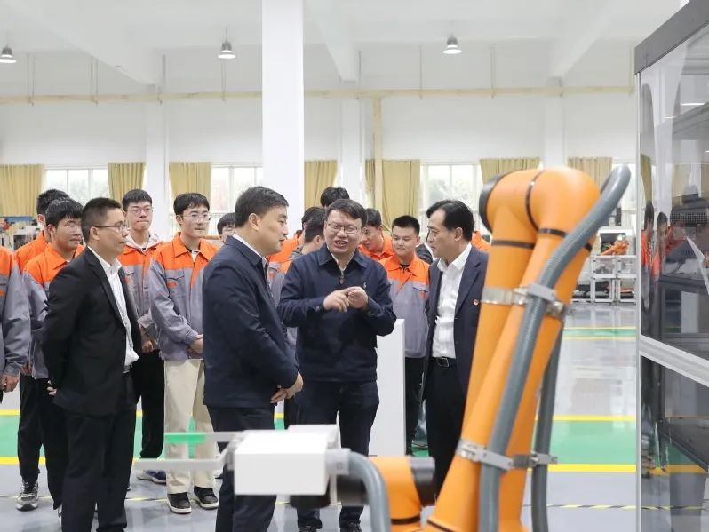 參觀鄧建軍工匠學(xué)院實(shí)訓(xùn)室(前排從右至左:校長楊勁松、全國勞模鄧建軍、黨委書記席海濤)
