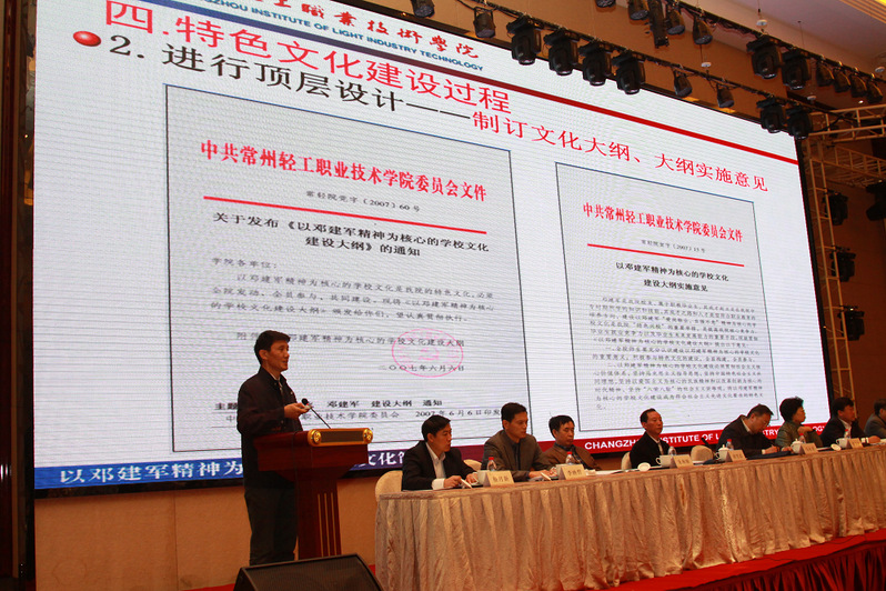 “搜索枯腸”貌似沒有結(jié)果,山重水復(fù)疑無路之時,新的思路出現(xiàn)了:我發(fā)現(xiàn)自從特色報(bào)告出爐后,很多部門尤其是二級學(xué)院,都在自覺或不自覺地開展跟特色文化有關(guān)的活動。這些具體活動或工作,學(xué)校層面根本想不到,也沒必要去設(shè)計(jì)、思考、做計(jì)劃。學(xué)校層面只需要出原則、明方向——于是我想到了擬寫學(xué)校文化建設(shè)大綱和大綱實(shí)施意見。經(jīng)過近一年的思考,《常州輕工職業(yè)技術(shù)學(xué)院以鄧建軍精神為核心的學(xué)校文化建設(shè)大綱》和大綱實(shí)施意見正式公布。大綱從鄧建軍精神引申出我們作為高職學(xué)院進(jìn)行學(xué)校文化建設(shè)的三大原則:倡導(dǎo)自信自強(qiáng)自立原則,引領(lǐng)創(chuàng)新創(chuàng)優(yōu)創(chuàng)業(yè)原則,強(qiáng)化工匠精神培育原則——使全校的各項(xiàng)工作都能從鄧建軍精神和三大原則中尋找到結(jié)合點(diǎn),為特色文化全員共建創(chuàng)造了條件。