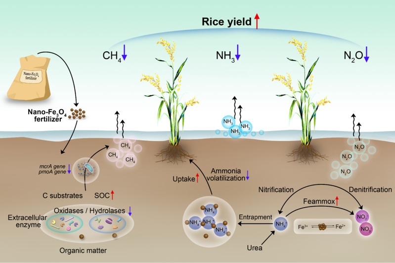 長期以來,傳統(tǒng)肥料施用難以解決糧食安全和溫室氣體排放之間的矛盾,亟需開發(fā)新型肥料。近年來,鐵元素在土壤生態(tài)系統(tǒng)的元素生物地球化學(xué)循環(huán)耦合過程中的重要性日益凸顯。于涌杰博士長期跟蹤研究納米鐵肥對整個農(nóng)田生態(tài)系統(tǒng)全局性的影響,利用納米賦能來構(gòu)建氣候智慧型農(nóng)業(yè),以應(yīng)對日益加劇的全球變化。通過4年的長期田間實驗,他發(fā)現(xiàn)納米氧化鐵肥的施用能夠減少稻田溫室氣體的排放,增加土壤碳匯,同時促進(jìn)作物產(chǎn)量,為構(gòu)建氣候智能型農(nóng)業(yè),應(yīng)對全球變化提供了理論依據(jù)和實踐指導(dǎo)。