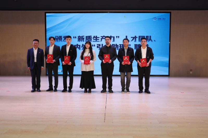 陳江為我校優秀教師代表劉進福、武棟、于涌杰、沈雷、吳晶津、任知洋等頒發“新質生產力人才團隊代表”證書和海內外“引才助理”聘書。