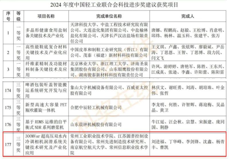 12月13日,從產(chǎn)學(xué)研合作處傳來(lái)喜訊,在近日由中國(guó)輕工業(yè)聯(lián)合會(huì)公布的2024年度中國(guó)輕工業(yè)聯(lián)合會(huì)科學(xué)技術(shù)獎(jiǎng)建議獲獎(jiǎng)項(xiàng)目名單中,由我校和江蘇源普控制設(shè)備有限公司、常州先進(jìn)制造技術(shù)研究所、南京航空航天大學(xué)等單位聯(lián)合完成的《300MVar超高壓雙水內(nèi)冷調(diào)相機(jī)潤(rùn)滑系統(tǒng)關(guān)鍵技術(shù)研究及產(chǎn)業(yè)化應(yīng)用》項(xiàng)目成果獲科學(xué)技術(shù)進(jìn)步獎(jiǎng)三等獎(jiǎng)。全國(guó)范圍內(nèi)共有194個(gè)項(xiàng)目脫穎而出,榮獲殊榮。