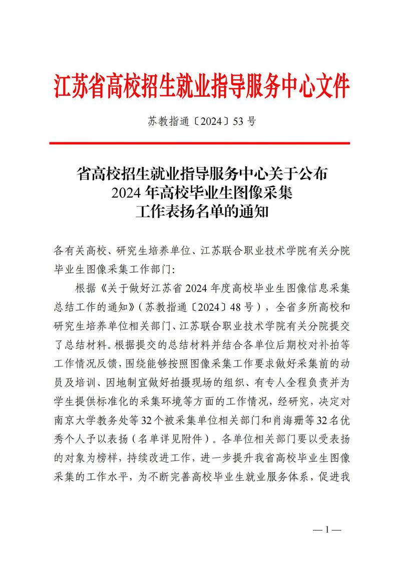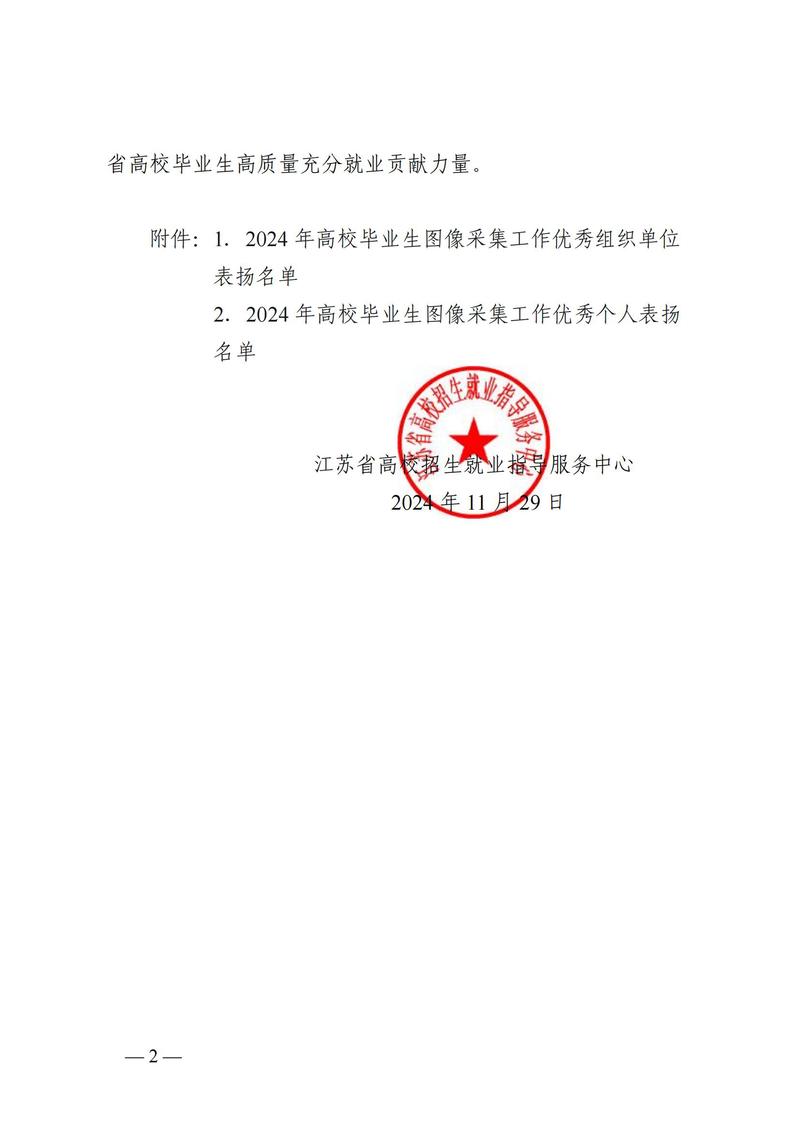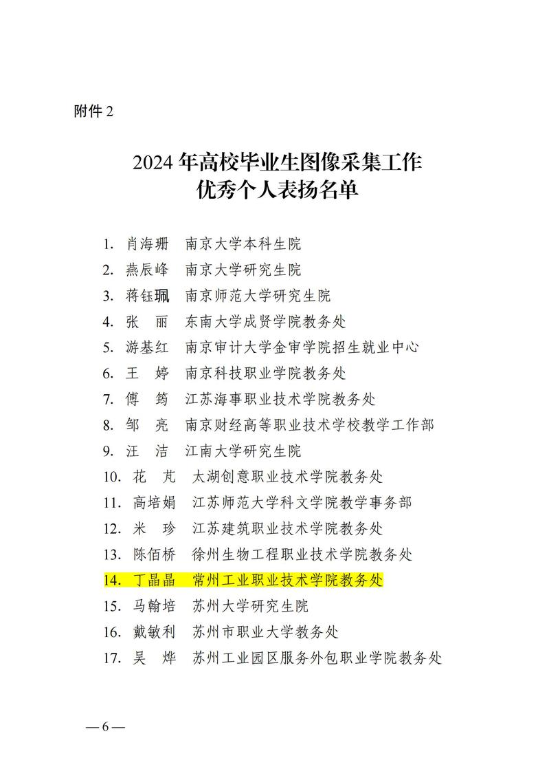 近日,江蘇省高校招生就業指導服務中心公布了江蘇省2024年高校畢業生圖像采集工作優秀組織獎和先進個人獲獎名單。全省高校和研究生培養單位中共32個單位獲優秀組織獎,32人獲先進個人表彰。我校教務處榮獲“優秀組織獎”,丁晶晶老師榮獲“優秀個人”稱號。