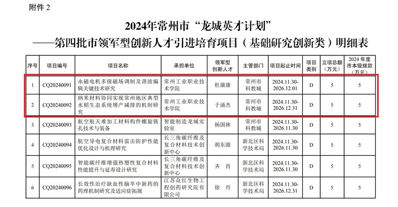近日,常州市發(fā)布2024年“龍城英才計(jì)劃”第四批領(lǐng)軍型創(chuàng)新人才引進(jìn)培育項(xiàng)目立項(xiàng)名單。我校材料工程學(xué)院于涌杰博士和智能控制學(xué)院杜康康博士雙項(xiàng)目入選基礎(chǔ)研究創(chuàng)新類項(xiàng)目,是常州市本年度唯一獲該項(xiàng)目立項(xiàng)的高職院校,我校也成為全市連續(xù)兩年斬獲該項(xiàng)目的高職院校。此次入選,標(biāo)志著我校在高層次人才引培、高水平團(tuán)隊(duì)建設(shè)方面取得了又一次突破。