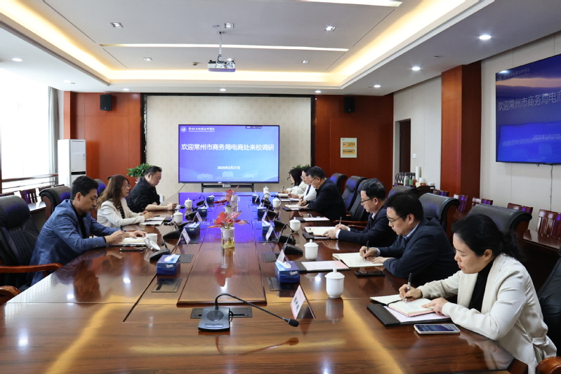 3月27日,常州市商務局電商處處長吳夢憬、副處長盧魯及武進區商務局市場科科長孫剛一行來校調研。副校長檀祝平主持會議。