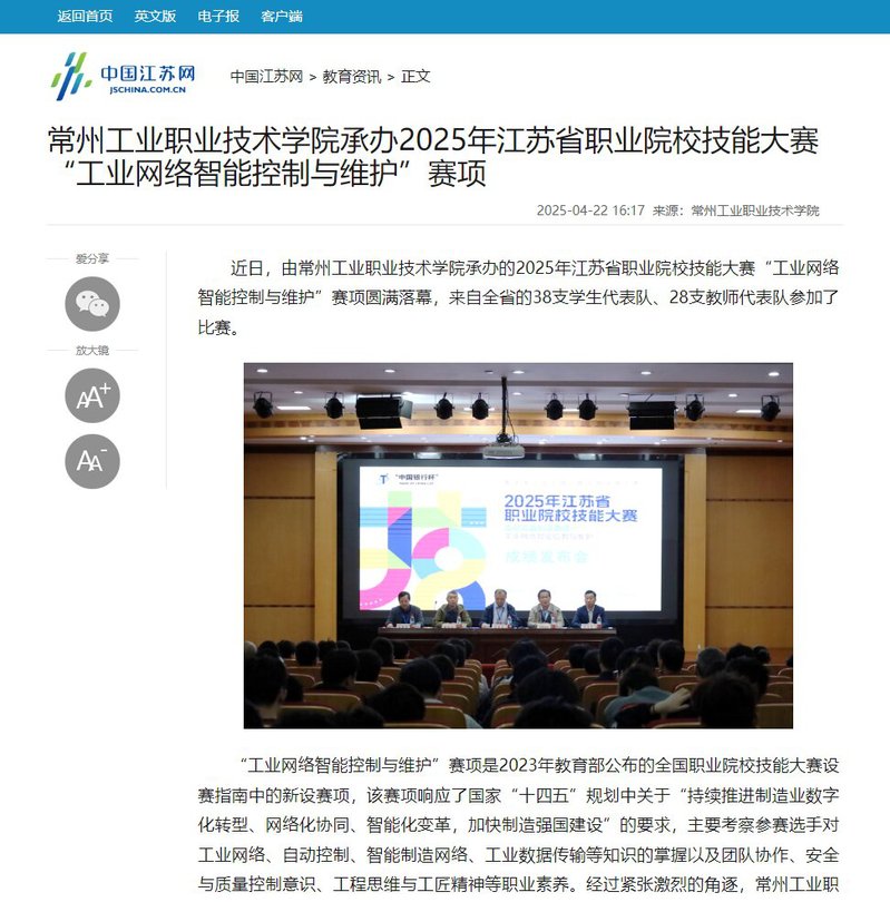 中國江蘇網:常州工業職業技術學院承辦2025年江蘇省職業院校技能大賽“工業網絡智能控制與維護”賽項