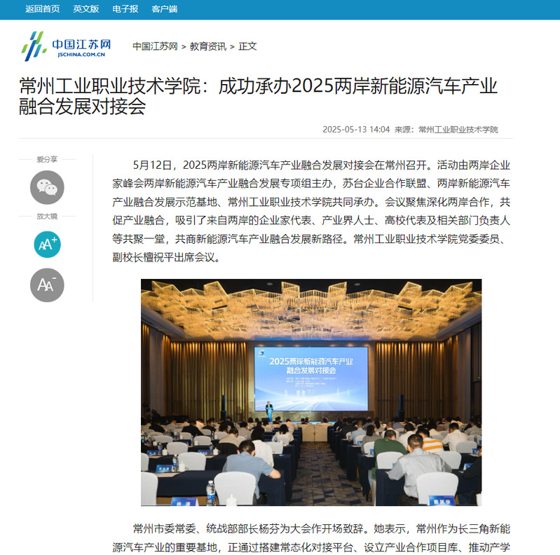 中國江蘇網:常州工業職業技術學院:成功承辦2025兩岸新能源汽車產業融合發展對接會