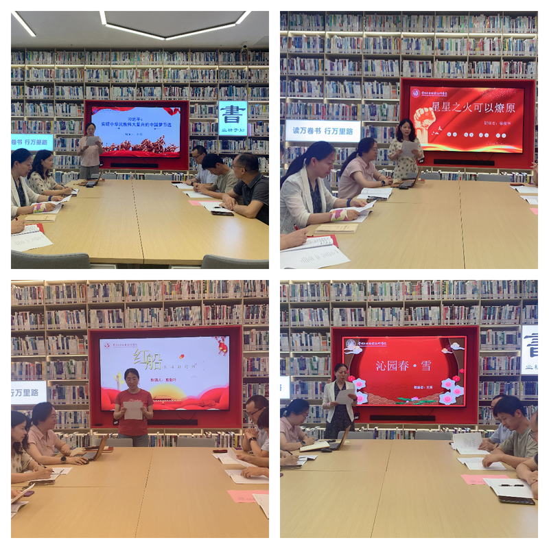 活動伊始,支部書記李斐發表致辭。她著重強調了紅色經典誦讀在傳承紅色基因、深化黨員教育方面的重要意義,鼓勵全體黨員通過誦讀經典,讓紅色文化在朗朗書聲中煥發出新的生機與活力,為即將到來的建黨節獻上一份特殊而珍貴的禮物。隨后,李斐率先垂范,誦讀了《習近平:實現中華民族偉大復興的中國夢(節選)》,為活動拉開序幕。黨員們依次上臺,聲情并茂地演繹了《星星之火可以燎原》《沁園春?雪》《七律?長征》等一系列經典紅色作品。她們或激昂高亢、或低沉有力的嗓音,將一篇篇紅色經典展現得淋漓盡致,讓現場氣氛熱烈非凡。