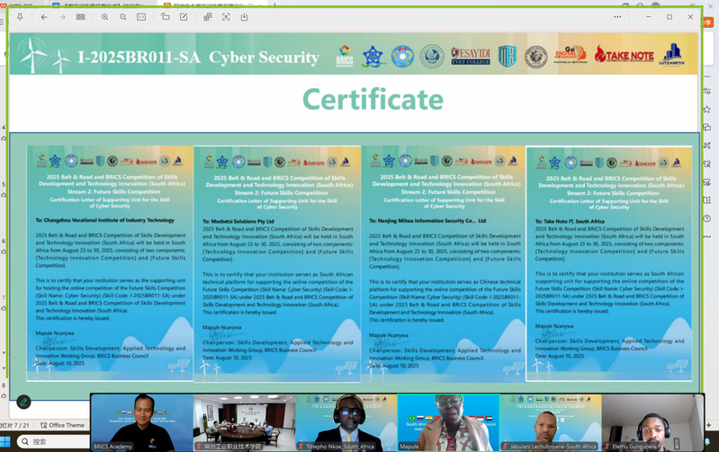8月10日,2025第九屆金磚國家技能發展與技術創新大賽南非國際賽之未來技能挑戰賽(網絡安全賽項)賽前訓練營開營儀式在我校舉行。南非國際賽中方競賽首席專家、江蘇大學李致遠教授,南京米好信息安全有限公司總經理胡正好,我校副校長蔣正炎出席線下活動。金磚國家工商理事會技能發展、應用技術與創新中方工作組主席劉振英、南非工作組主席Mapule Ncanywa,南非技術支持代表及首席專家Tshepho Nkoe出席線上活動。