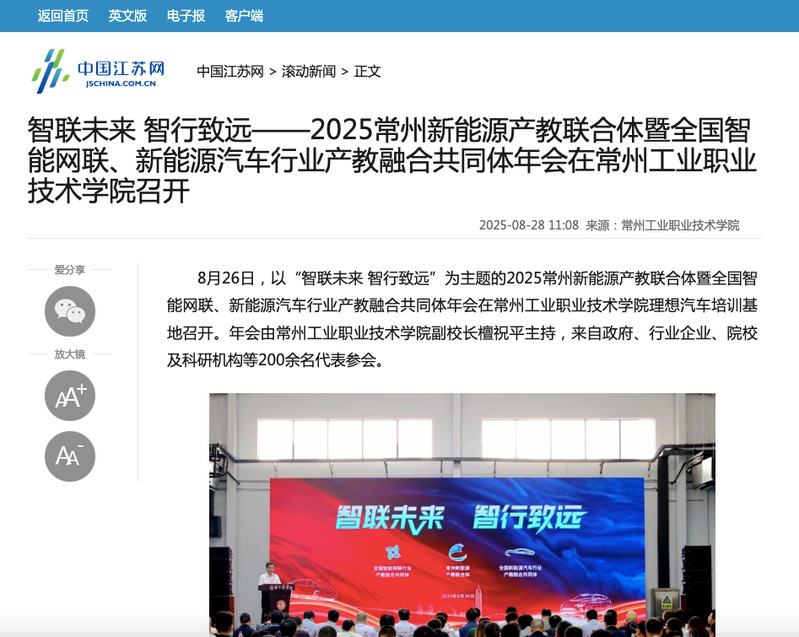 中國江蘇網:2025常州新能源產教聯合體暨全國智能網聯、新能源汽車行業產教融合共同體年會在常州工業職業技術學院召開
