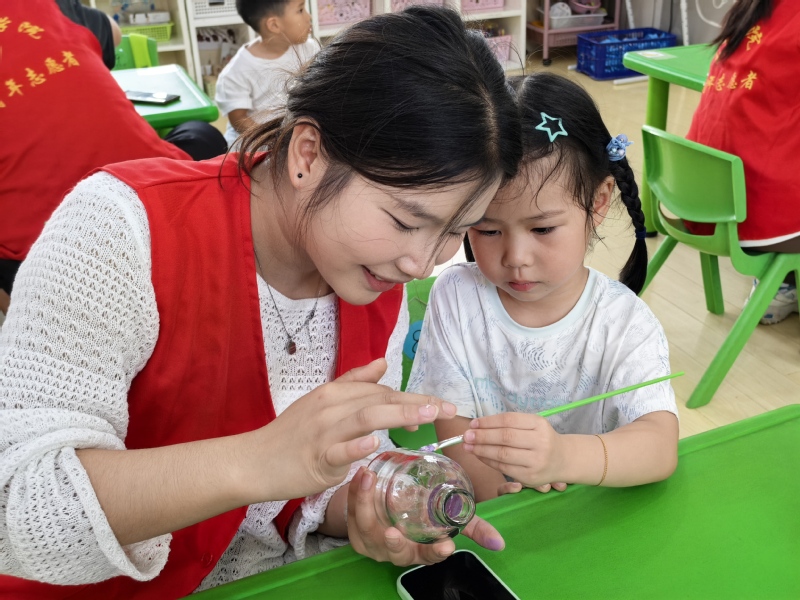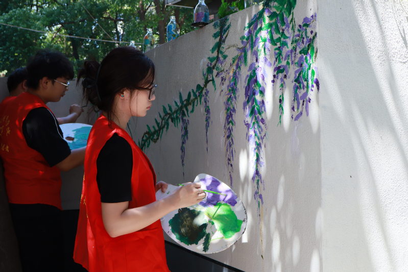 大學生志愿者根據前期設計方案,搭梯子粉刷墻面,和老人們協作共同繪制紫藤花“社區文藝長廊”;社區老年居民們化身“銀發主理人”,指導志愿者們擺放手工工具、規劃“共享藝術工坊”的物品收納;實踐團成員還來到社區幼兒園,和小朋友們一起用畫筆在玻璃瓶上涂鴉,將舊物改造成創意擺件,在動手過程中學習“變廢為寶”的環保知識。原本雜亂的廢棄水泵房,變成了擺放著手工臺、工具柜的“共享藝術工坊”;斑駁的空置墻面,成了社區休閑;閑置角落也種上綠植、擺上改造舊物,變身“鄰里微花園”。72歲的錢奶奶看著煥然一新的空間,笑著說:“不僅環境變美了,我們還能自己管、自己用,住著更舒心了!”