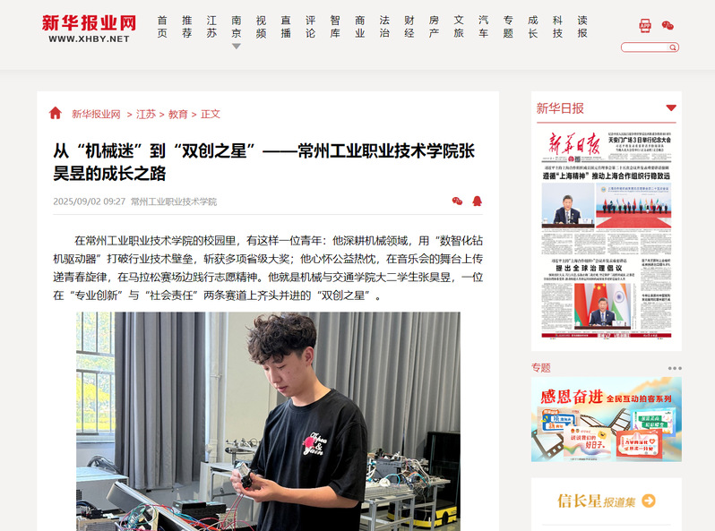 新華報業網:從“機械迷”到“雙創之星”——常州工業職業技術學院張昊昱的成長之路