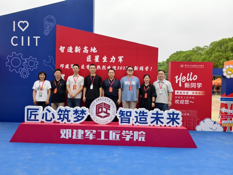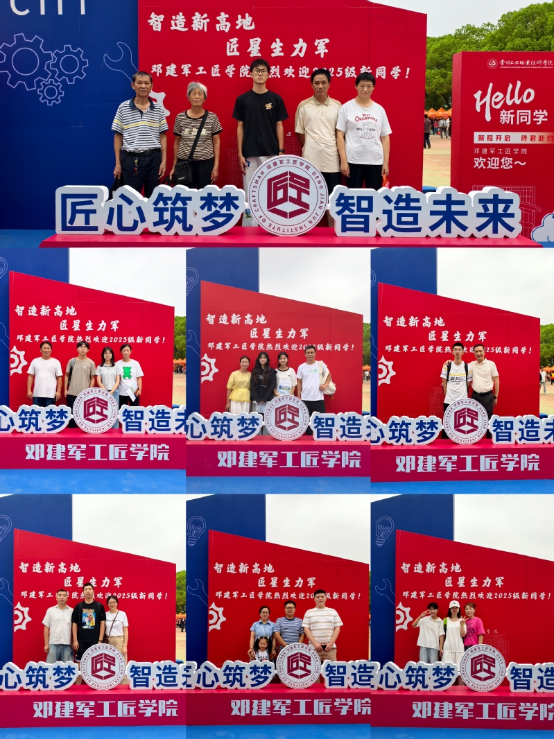 刻有“鄧建軍工匠學院”院訓的文化墻成為溫馨的“打卡點”,新生與家長們紛紛駐足合影。有的家庭全員出鏡,笑容里滿是對未來的期許;有的新生與新同學并肩而立,眼神中透著對專業學習的向往;還有的家長主動與老師、志愿者合影,傳遞對學院的信任與感謝。“這張合影不只是孩子入學的紀念,更是我們家校攜手的起點。” 一位新生家長的心聲,道出了家校協同育人的共識。