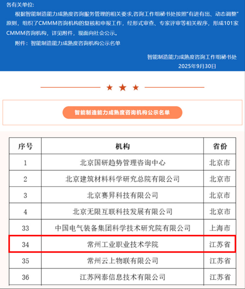 近年來,我校積極響應(yīng)國家智能制造發(fā)展戰(zhàn)略,成立了以CMMM主任評估師、培訓(xùn)講師盧劍偉教授為院長的常州工業(yè)數(shù)字化創(chuàng)新研究院(以下簡稱“數(shù)研院”),截至已成功為廣汽因湃、北汽重卡、煙草行業(yè)、TCL、西門子、梅特勒-托利多等五十多家知名企業(yè)提供智能制造相關(guān)服務(wù),助力企業(yè)提升生產(chǎn)效率、降低運營成本,實現(xiàn)智能化升級;聯(lián)合中國電子技術(shù)標準化研究院在國內(nèi)率先開設(shè)了以《智能制造能力成熟度模型》國家標準為引領(lǐng)的智能制造課程;承辦了全國數(shù)字化轉(zhuǎn)型國家標準(DTMM)培訓(xùn)班,與武進高新區(qū)聯(lián)合舉辦了2024年首期智能制造CMMM普及培訓(xùn)班、與武進區(qū)聯(lián)合舉辦2025年護航新型工業(yè)化網(wǎng)絡(luò)和數(shù)據(jù)安全活動等重要行業(yè)活動,為區(qū)域乃至全國智能制造領(lǐng)域的人才培養(yǎng)與技術(shù)交流搭建了優(yōu)質(zhì)平臺。并入選常州市智改數(shù)轉(zhuǎn)網(wǎng)聯(lián)服務(wù)商、承建了常州市數(shù)字化轉(zhuǎn)型促進中心。