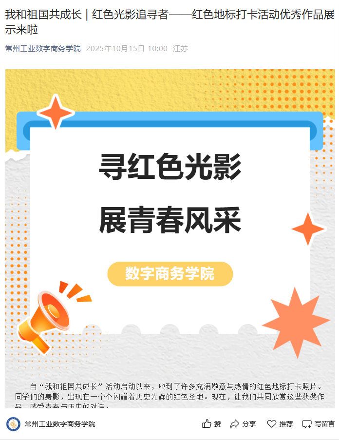連日來,數(shù)字商務(wù)學(xué)院“E路行攝”輔導(dǎo)員工作室精心策劃并組織開展了“我與祖國共成長”網(wǎng)絡(luò)育人主題系列教育活動,得到了全院學(xué)生的廣泛關(guān)注和積極參與。同學(xué)們通過鏡頭與筆觸,深刻感悟國家發(fā)展的偉大歷程,表達(dá)了與祖國同呼吸、共命運(yùn)的堅(jiān)定信念。