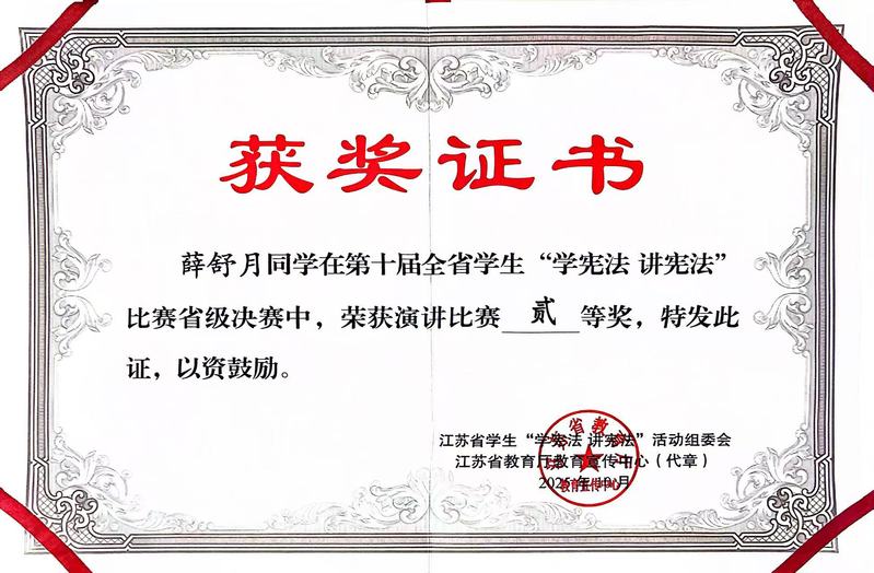 此次賽事競爭激烈,歷經校賽選拔推薦、省級初賽的層層篩選,最終薛舒月同學從百余位高校組參賽者中脫穎而出,成功躋身省級決賽。決賽設置主題演講與即興演講兩大核心環節,全面考察選手的憲法認知深度、語言表達能力與臨場應變水平。在主題演講環節,薛舒月以《憲法之光 守護成長》為題,將真摯情感與深刻思考融入演講之中,以情帶聲、以思促講,用生動的表達傳遞憲法精神。在極具挑戰性的即興演講環節,她沉著冷靜、思路清晰,圍繞“法治宣傳在家庭、學校與社會生活中的法律實踐”展開精準論述,邏輯嚴密、語言流暢,展現出對憲法精神的深刻理解與扎實的法治素養。
