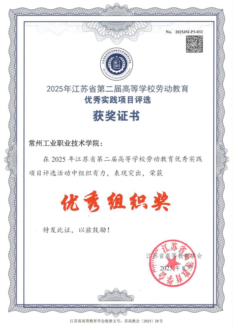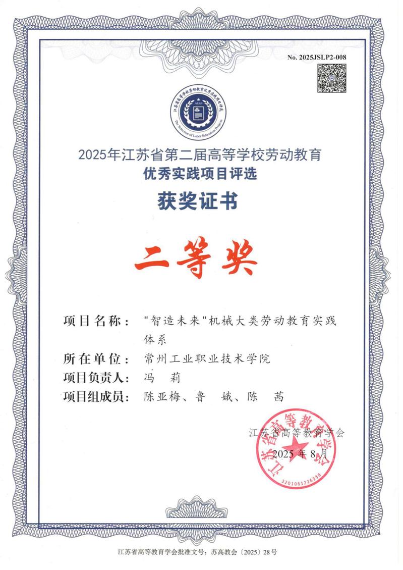 近日,江蘇省高等教育學會2025年高等學校勞動教育優(yōu)秀實踐項目評選結果出爐,我校信息工程學院何濤、袁凱烽,智能控制學院夷文玉、蔣金偉的項目獲一等獎,機械與交通學院馮莉的項目獲二等獎。同時,我校榮獲江蘇省第二屆高等學校勞動教育優(yōu)秀實踐項目評選活動優(yōu)秀組織獎。