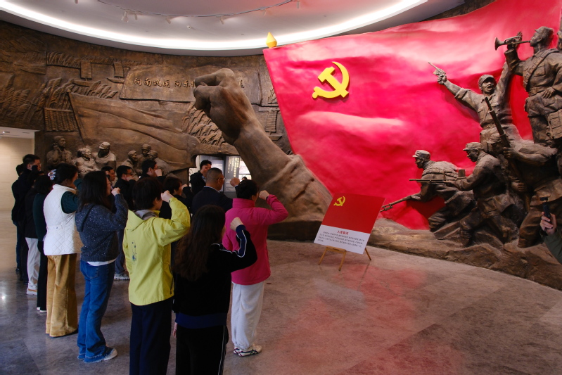 隨后,全員前往新四軍江南指揮部紀念館,開展紅色教育實踐活動。全體黨員在學校黨委委員、宣傳部部長季華的帶領下,面向黨旗和新四軍戰士雕像,舉起右拳,重溫入黨誓詞。大家在講解員的引導下,通過參觀珍貴的歷史實物和文獻資料,重溫了新四軍在江南地區開展抗日游擊戰爭的崢嶸歲月,深刻感悟了陳毅、粟裕等革命先輩堅定的理想信念、不怕犧牲的戰斗精神和親民愛民的優良作風。
