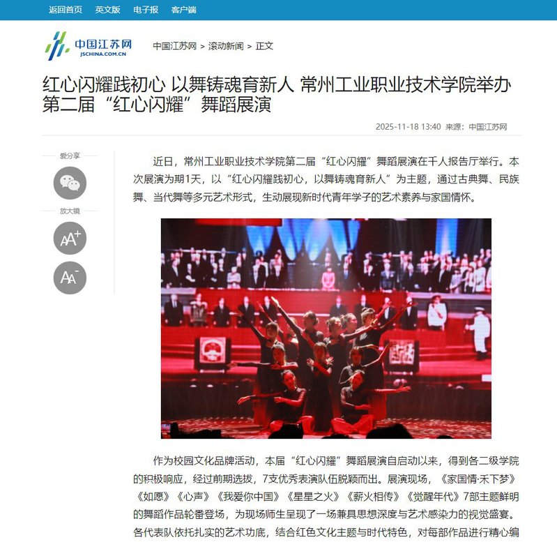 中國江蘇網:紅心閃耀踐初心 以舞鑄魂育新人 常州工業職業技術學院舉辦第二屆“紅心閃耀”舞蹈展演