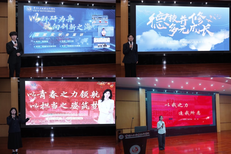 在最令人期待的風采展示環節,來自不同學院的九位國家獎學金獲獎代表依次上臺,分享了他們的成長故事和奮斗歷程。每位獲獎學生都結合自己的專業特色和學習經歷,從不同角度展現了當代大學生的精神風貌。他們有的在專業技能競賽中屢獲佳績,有的在社會實踐中鍛煉成長,有的在創新創業中勇于探索。他們的故事或勵志感人,或充滿智慧,或展現擔當,充分體現了我校學子“精益求精”的工匠精神和“自強不息”的奮斗姿態。